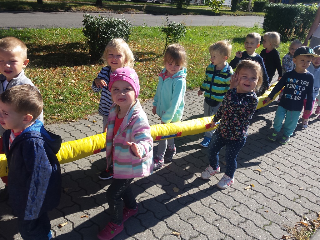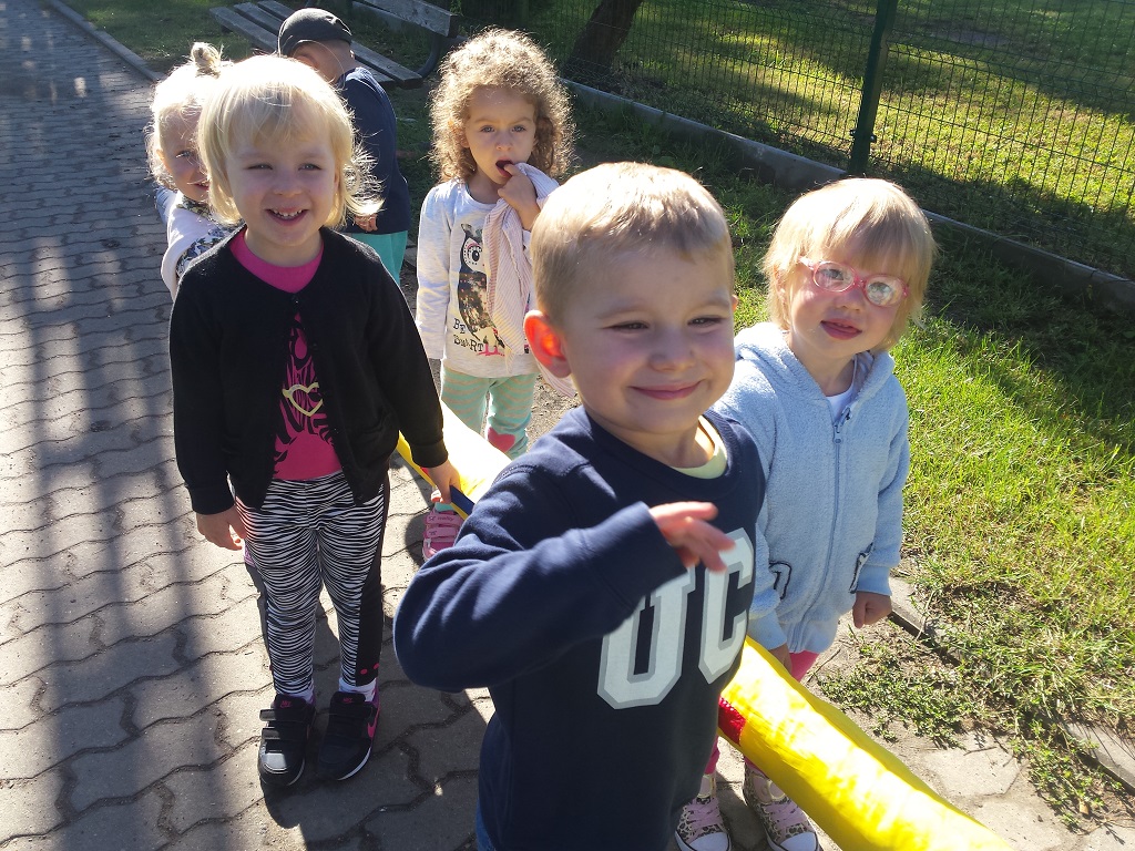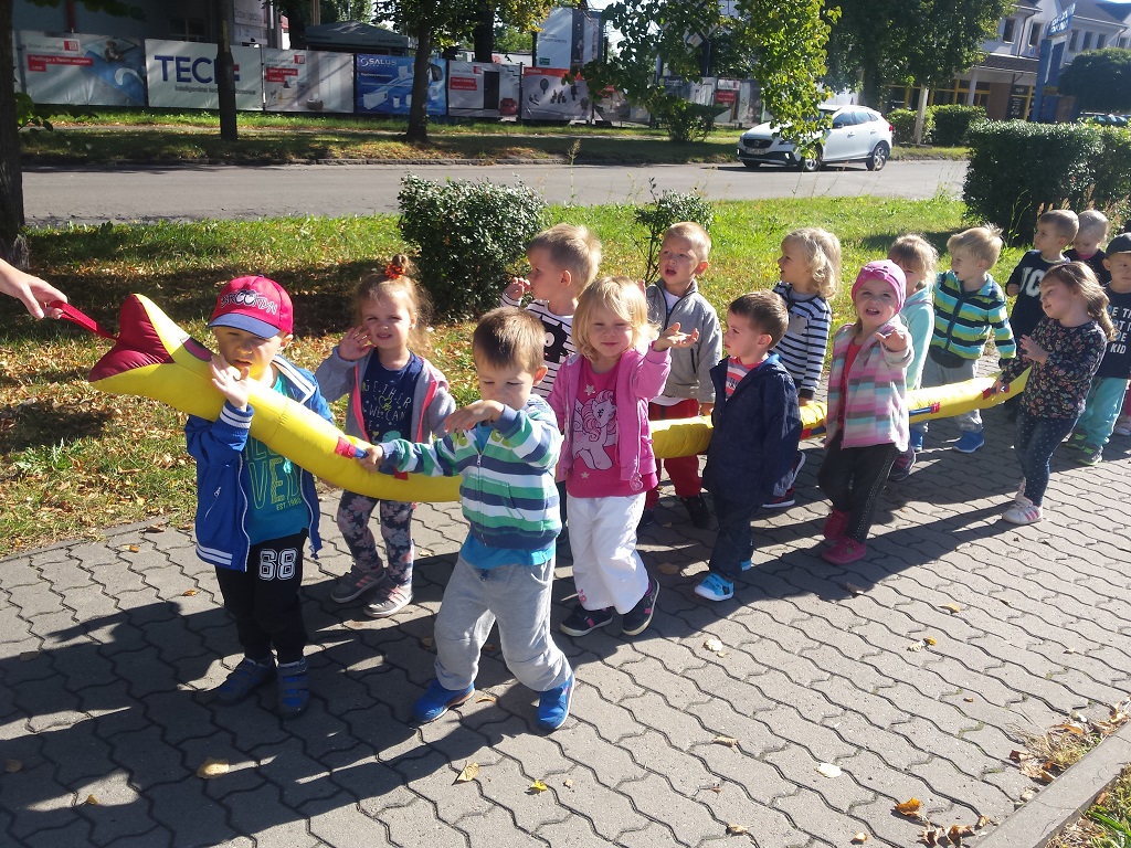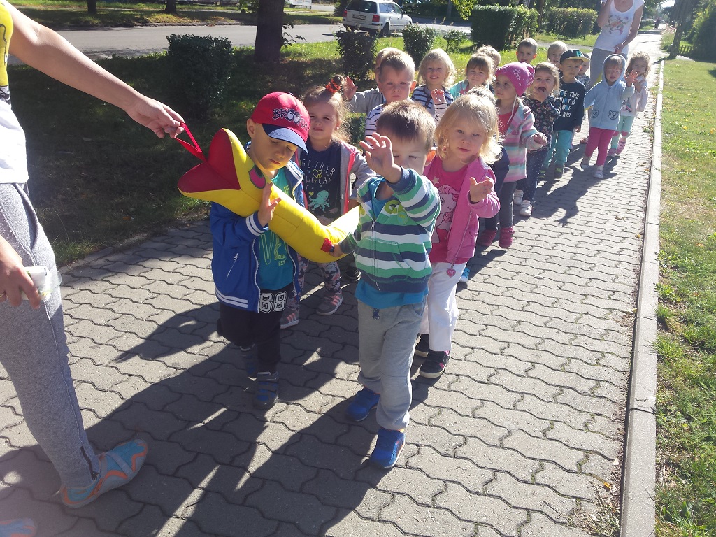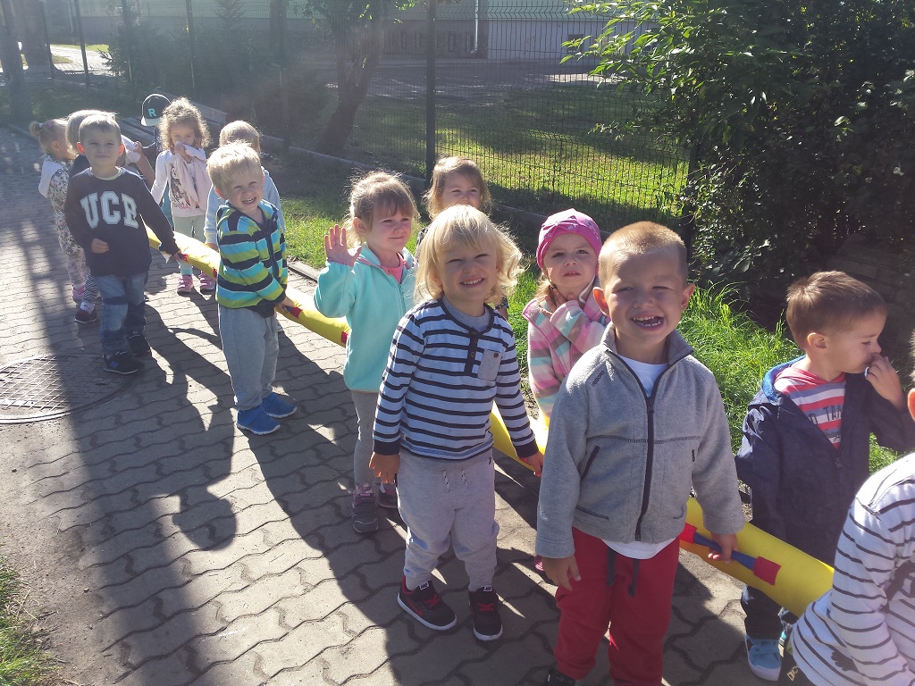 Dzieci z grupy ,,Poszukiwaczy” wybrały się na swój pierwszy spacer poza teren przedszkola. Korzystając z pięknej pogody najmłodsze przedszkolaki poznawały najbliższą okolicę. Pierwsze, jakże trudne zadanie, poruszanie się na spacerze w parach ułatwił ,,spacerowy wąż”, który ,,czuwał”, by żaden z maluszków nie oddalił się od grupy.