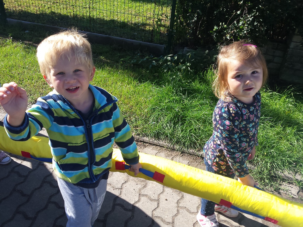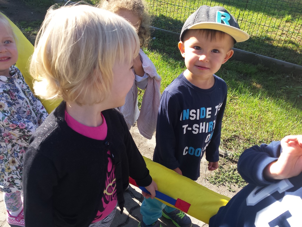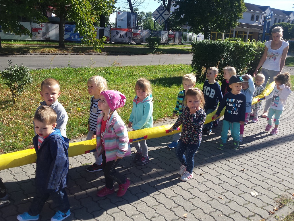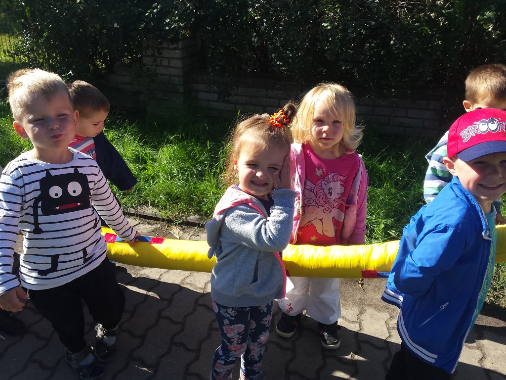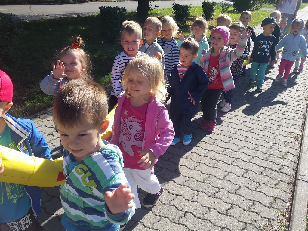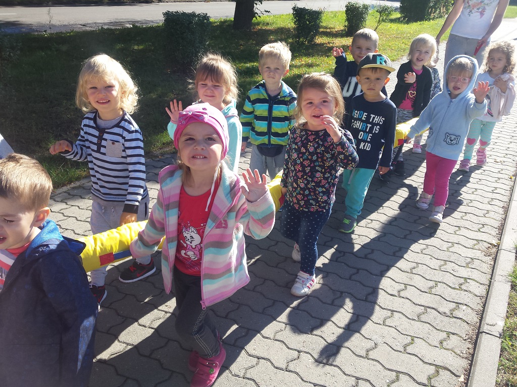 Dzieci z grupy ,,Poszukiwaczy” wybrały się na swój pierwszy spacer poza teren przedszkola. Korzystając z pięknej pogody najmłodsze przedszkolaki poznawały najbliższą okolicę. Pierwsze, jakże trudne zadanie, poruszanie się na spacerze w parach ułatwił ,,spacerowy wąż”, który ,,czuwał”, by żaden z maluszków nie oddalił się od grupy.