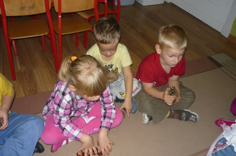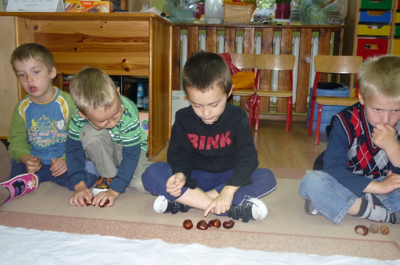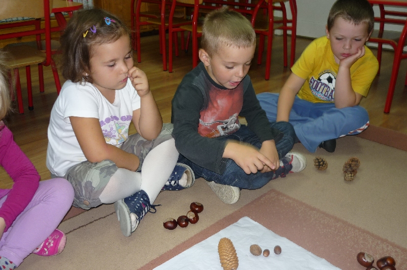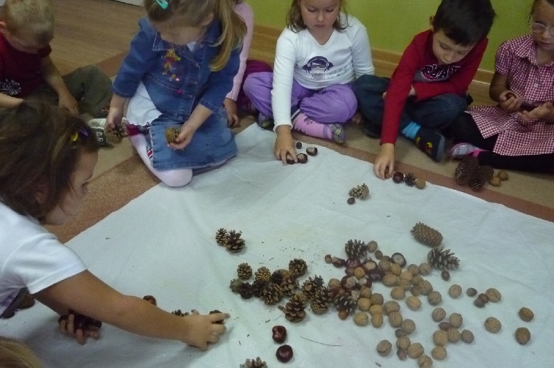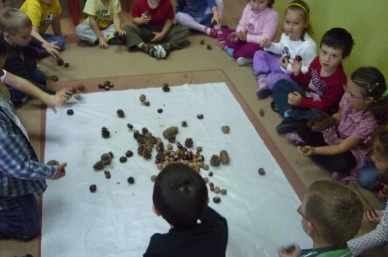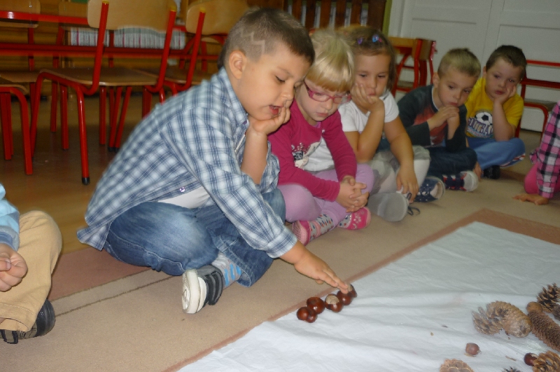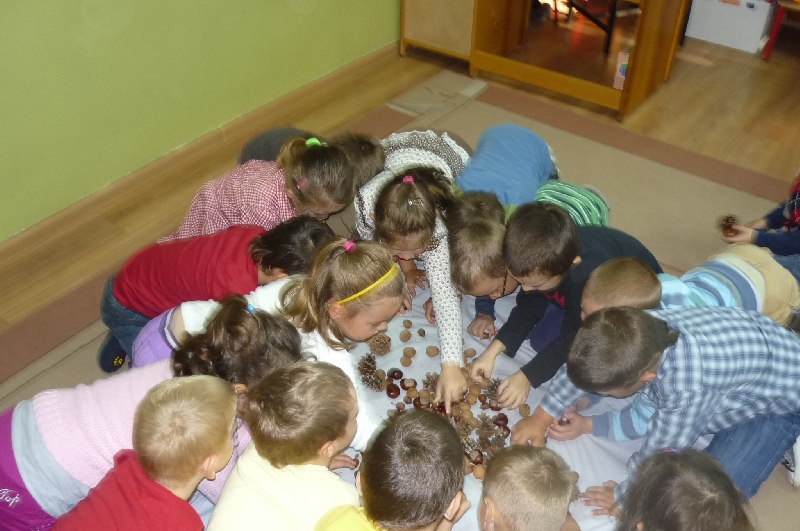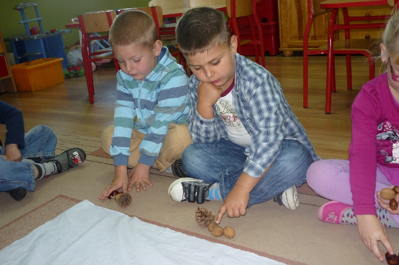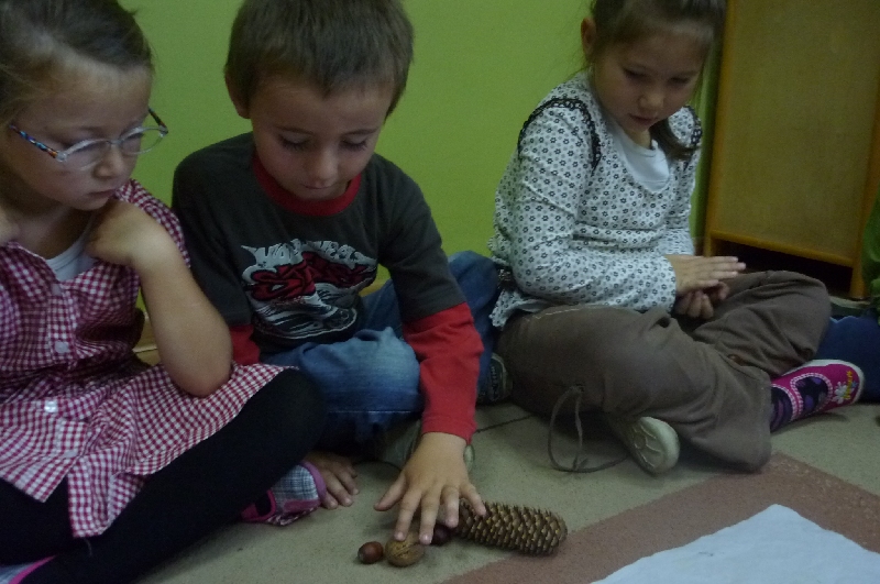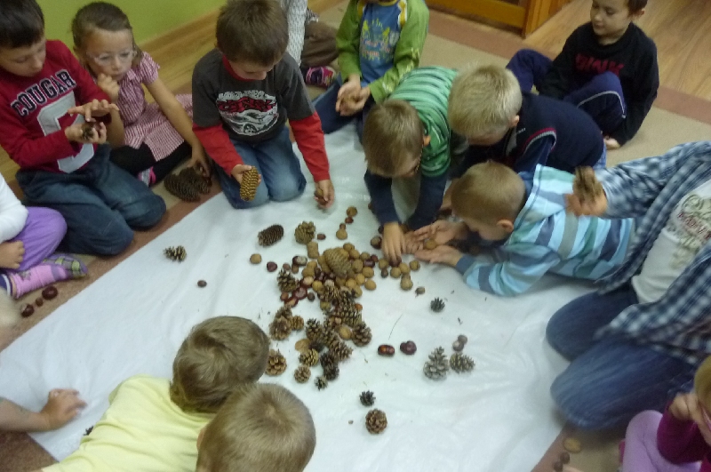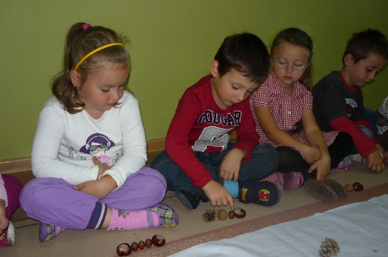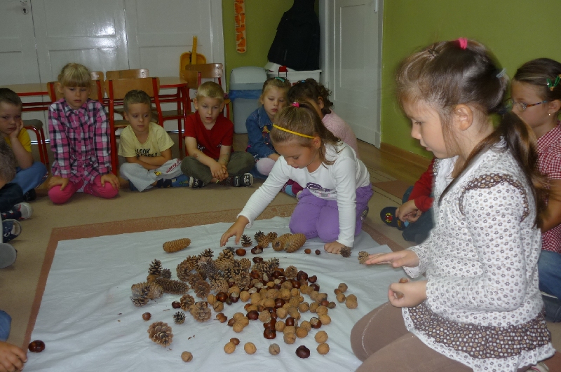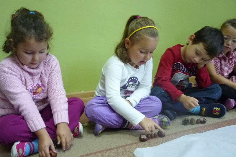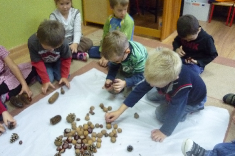Z pobytu na wycieczce w lesie przywieźliśmy mnóstwo darów jesieni. Tym razem, żeby było inaczej, ciekawiej to właśnie kasztany, szyszki, żołędzie służyły nam w doskonaleniu przeliczania i klasyfikowania.