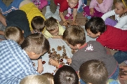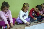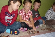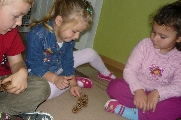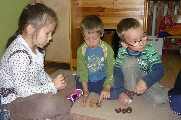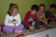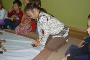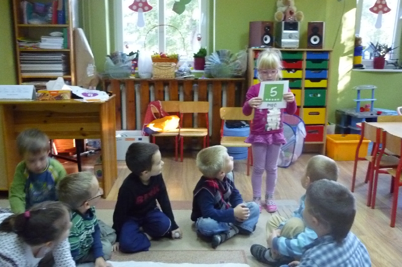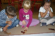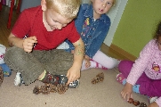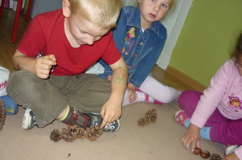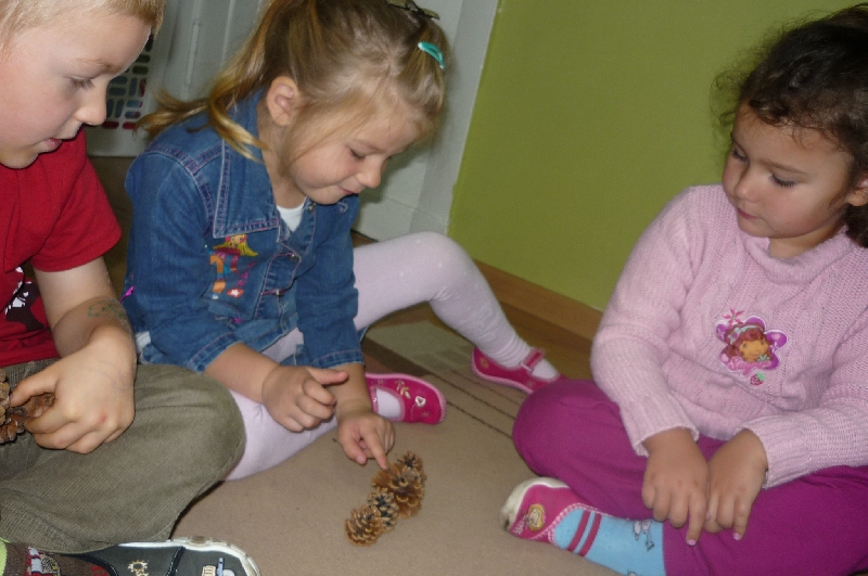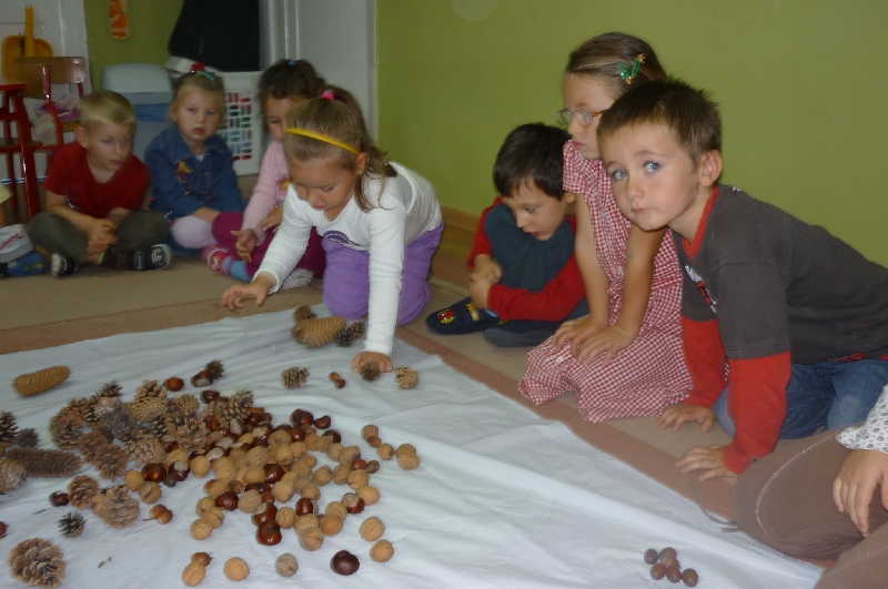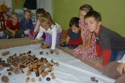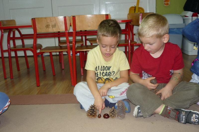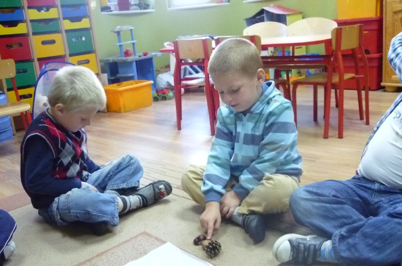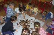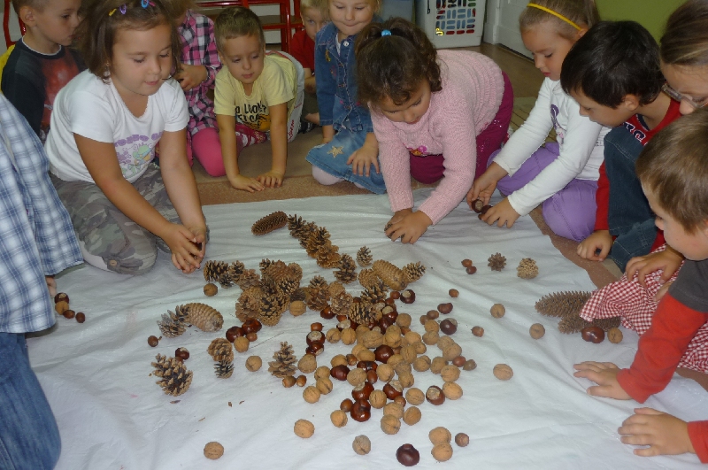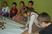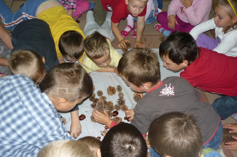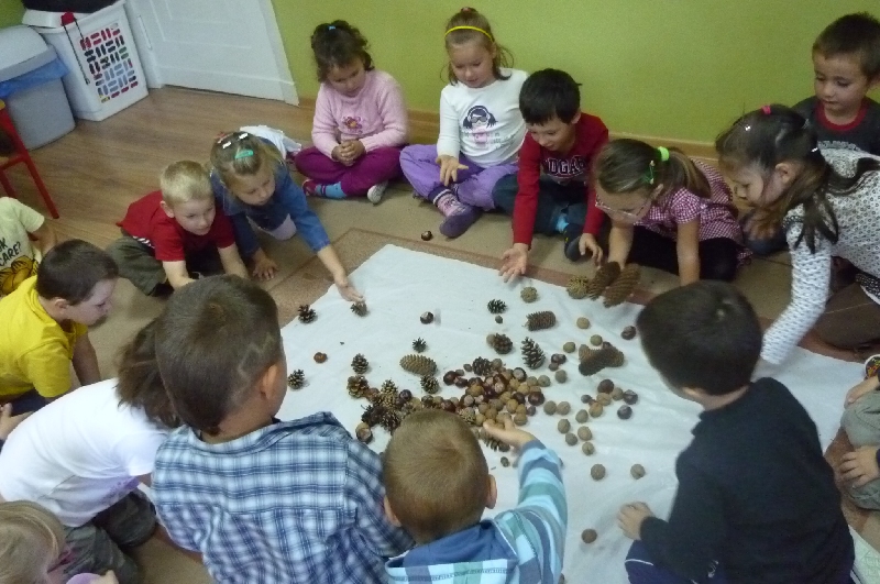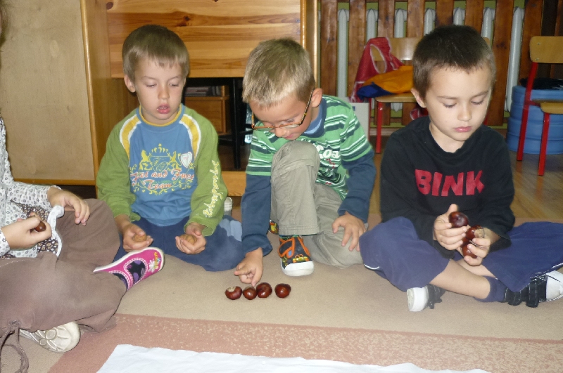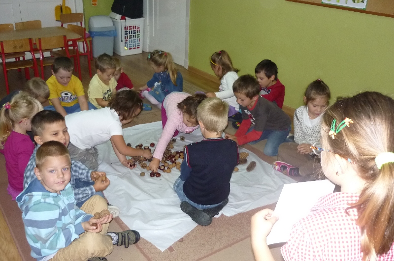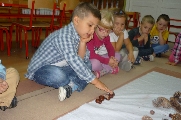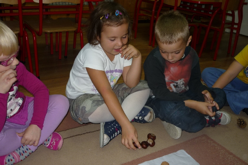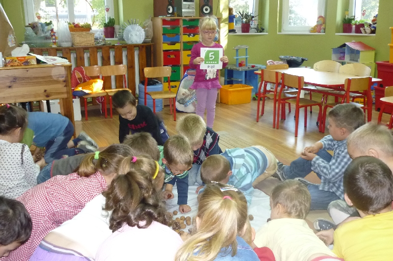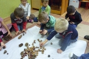 Z pobytu na wycieczce w lesie przywieźliśmy mnóstwo darów jesieni. Tym razem, żeby było inaczej, ciekawiej to właśnie kasztany, szyszki, żołędzie służyły nam w doskonaleniu przeliczania i klasyfikowania.