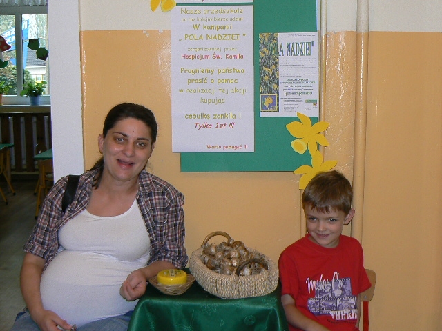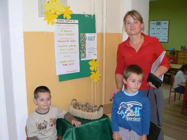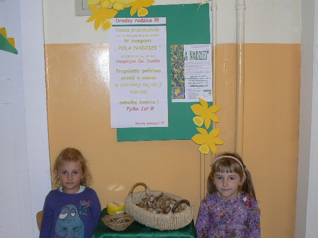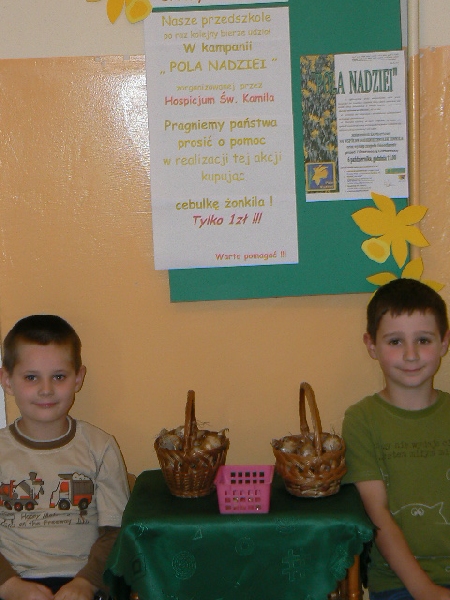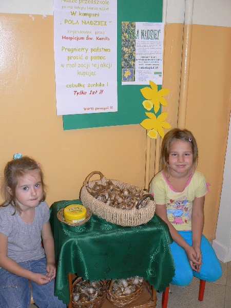 Nasze przedszkole wzięło udział w szóstej edycji kampanii ,,Pola Nadziei” zorganizowanej przez Hospicjum Św. Kamila w Gorzowie Wlkp. Grupa IV skutecznie zapraszała do zakupu cebulek żonkilów. Sprzedaż wyniosła 209 złotych. Dnia 6 października razem z dziećmi z grupy II posadziliśmy cebulki kwiatów w przedszkolnym ogrodzie . Bardzo dziękujemy Rodzicom za pieniężne wsparcie dla Hospicjum.