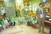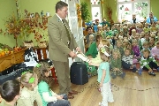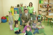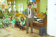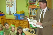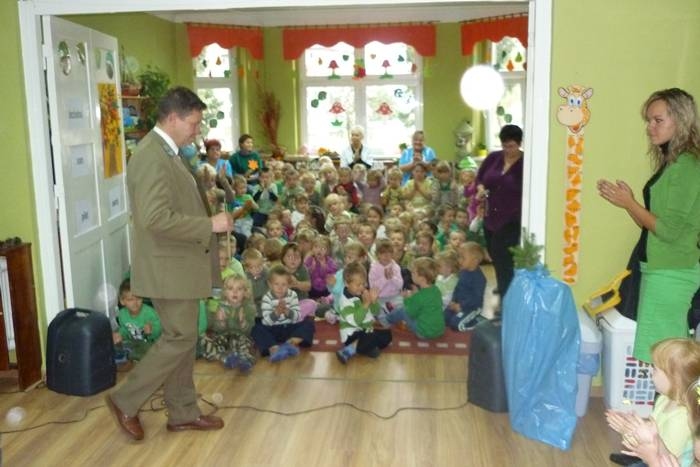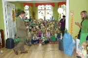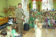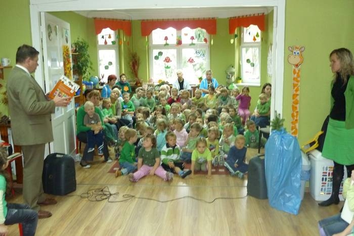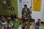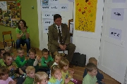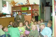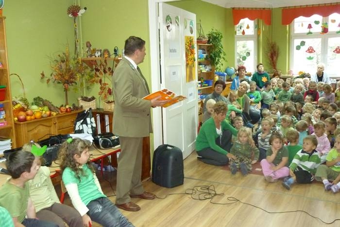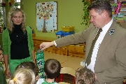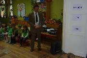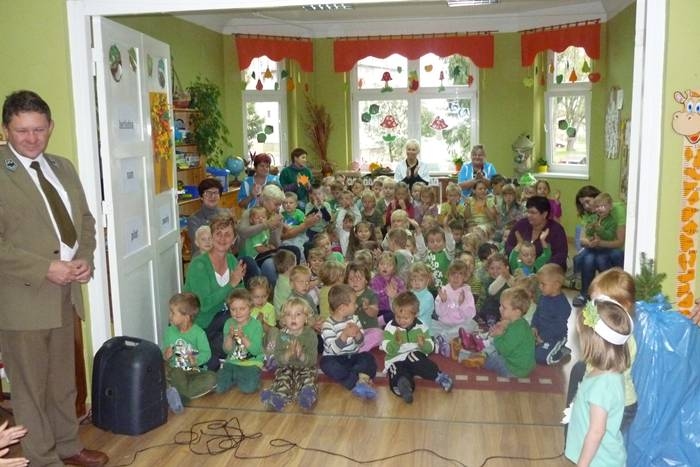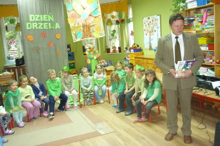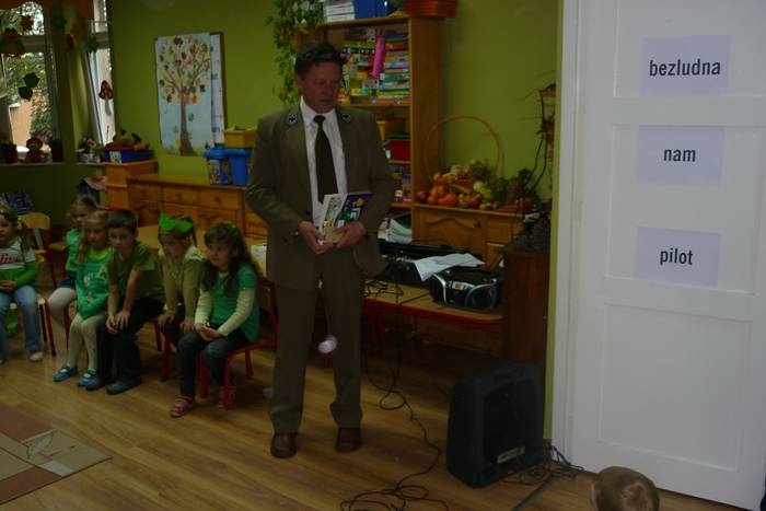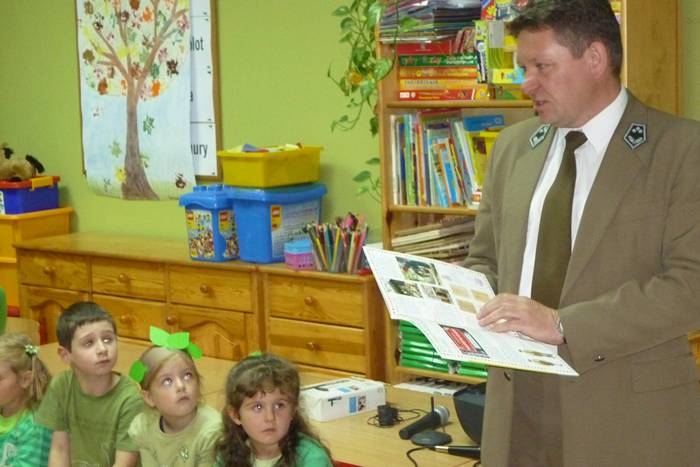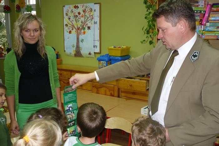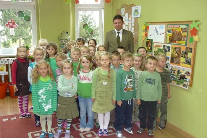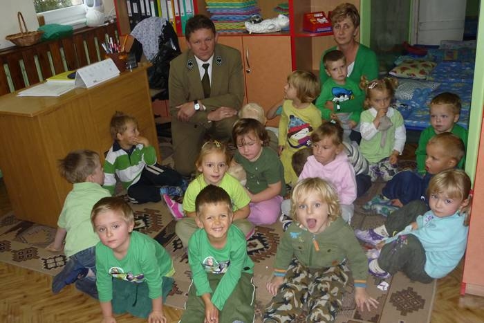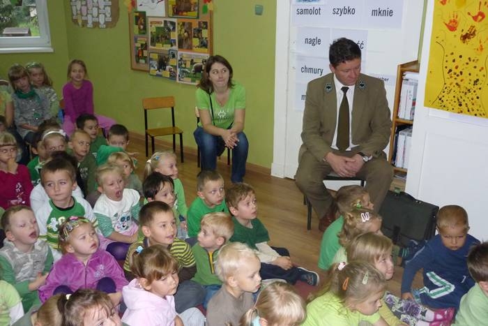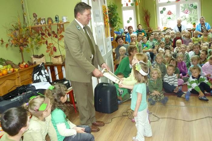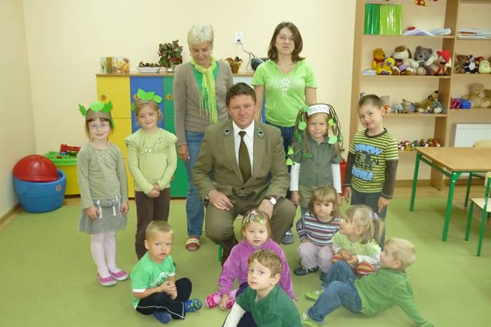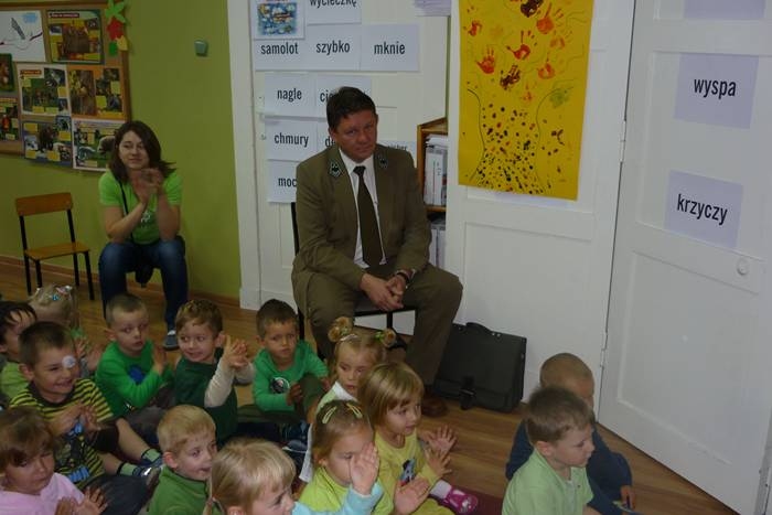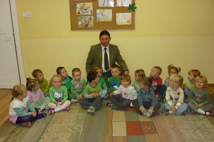 Dnia 10 października odwiedził nasze przedszkole Pan leśniczy Wojciech Ćwiejkowski. Na początku spotkania zaprezentował dzieciom swój mundur. Opowiedział o swojej pracy oraz o zwyczajach leśnych zwierząt, ich przysmakach zwłaszcza w okresie zimowym, kiedy trudno dotrzeć im do pożywienia. Dowiedzieliśmy się jakie znaczenie ma las w naszym życiu i inne ciekawostki dotyczące świata przyrody. Otrzymaliśmy od naszego gościa ciekawe przyrodnicze książki, jak również drzewko, które posadzimy w naszym przedszkolnym ogródku. Dzieci podziękowały serdecznie za miłe spotkanie i wręczyły dyplom .