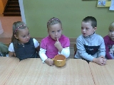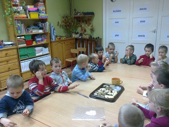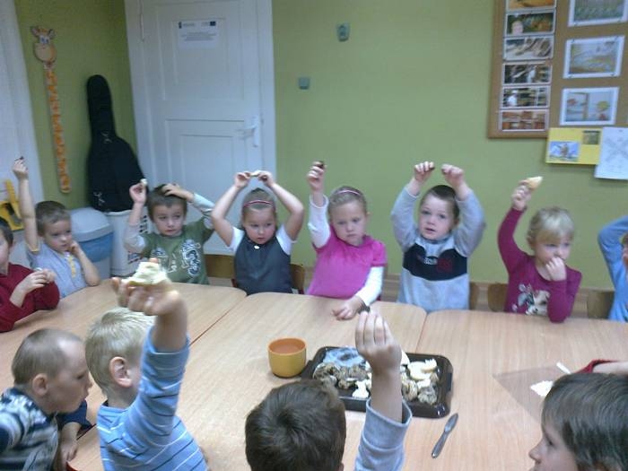 Dnia 17 października, pod takim hasłem przebiegały zajecia w grupie III. Podczas wspólnej zabawy i pracy poznalismy rózne rodzaje pieczywa, które mogliśmy skoszotować. Każdy z nas spróbował jak smakuje mąką i skąd się bierze ona w piekarni. Na koniec wszyscy byliśmy jak prawidziwi piekarze, "wypiekalismy" z plasteliny bułki, rogale, bagietki i chleby. To były smaczne zajęcia.