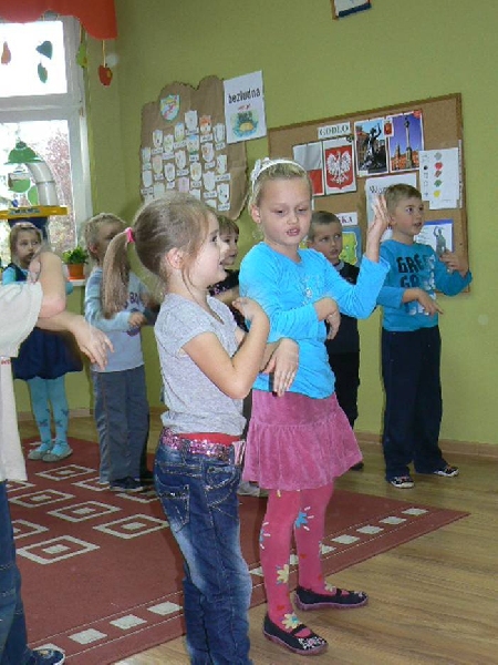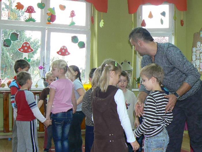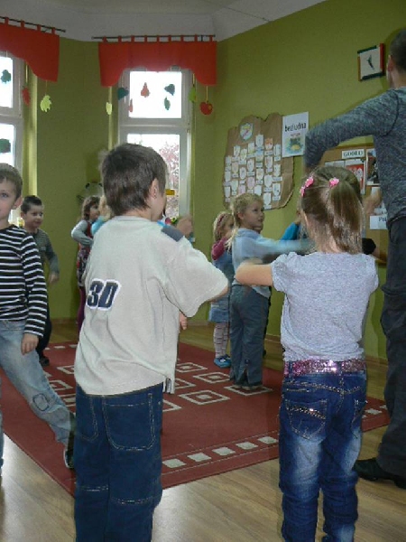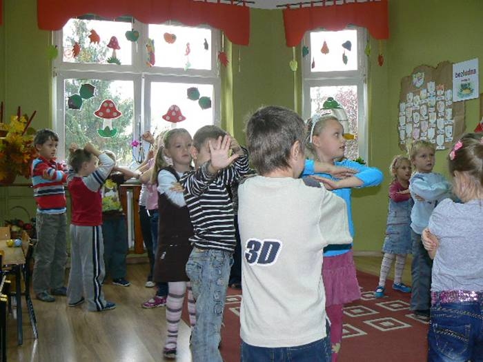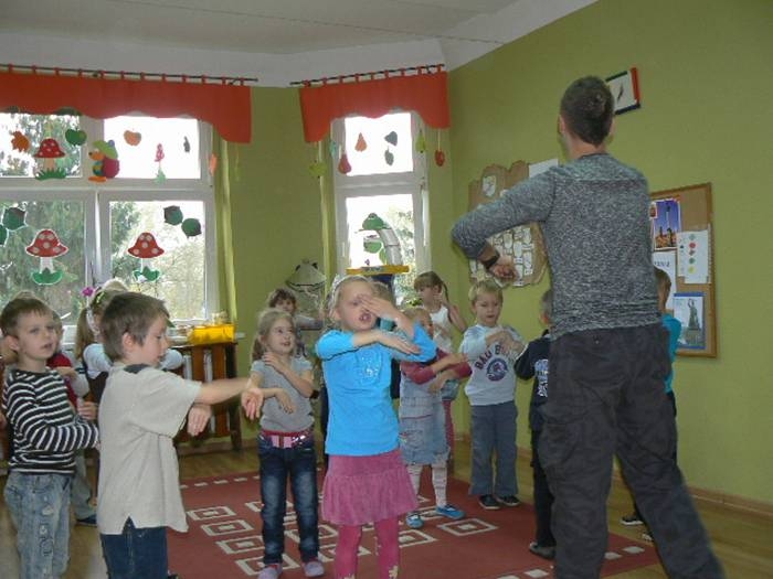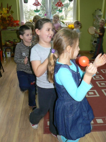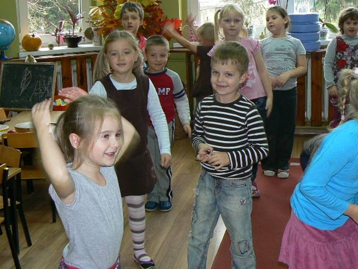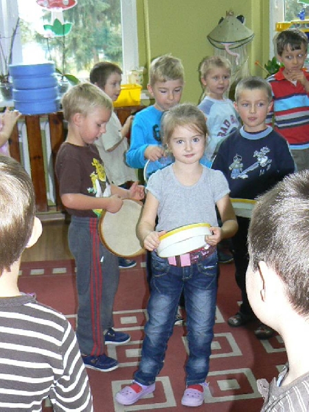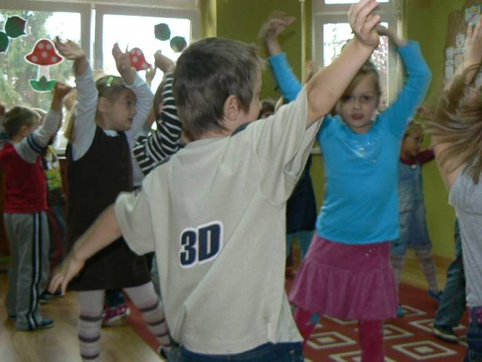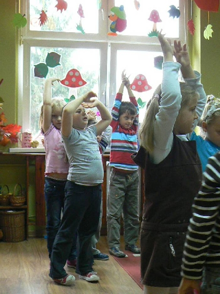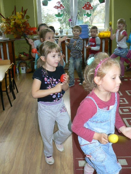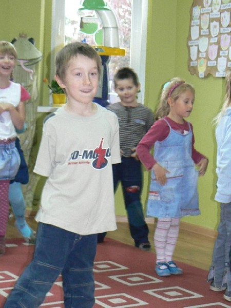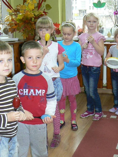 Skoki, podskoki, dużo śmiechu i wesołej zabawy jest przy muzyce na zajęciach rytmicznych u pana Adama. Przedszkolaki przygotowują piosenkę o jesiennych liściach na przedstawienie dla Rodziców. Pod bacznym okiem instruktora poznają także instrumenty i ich rodzaje.