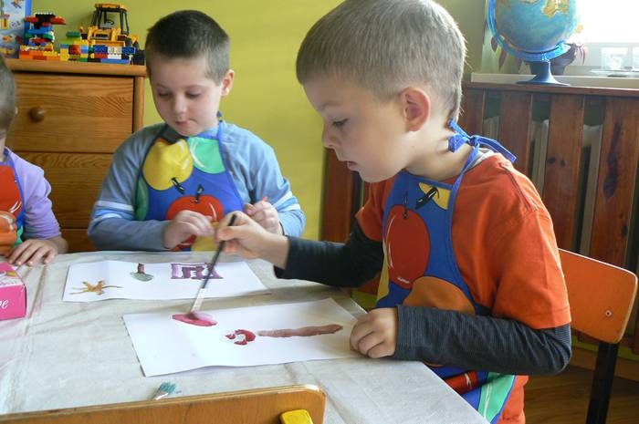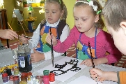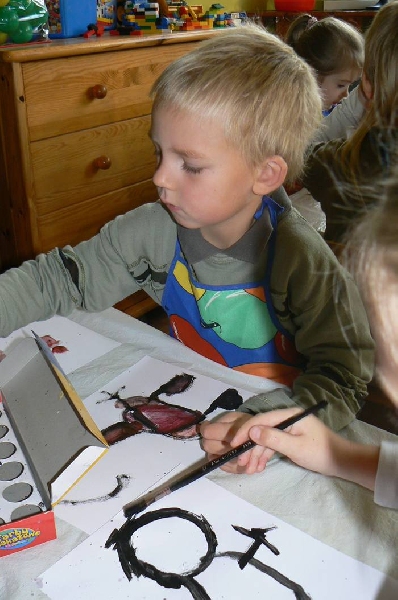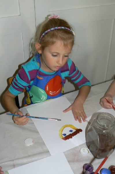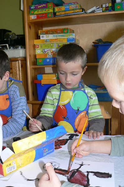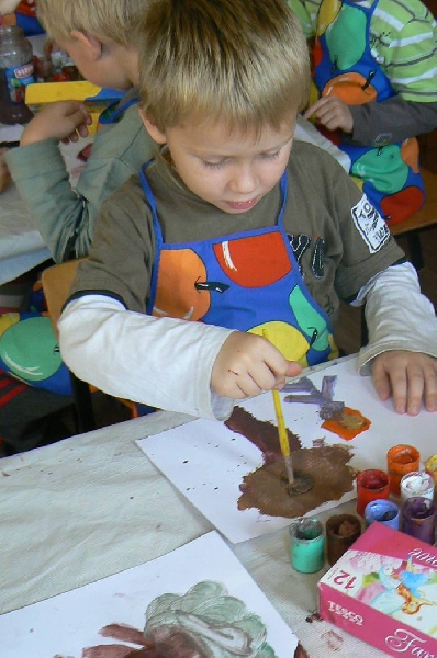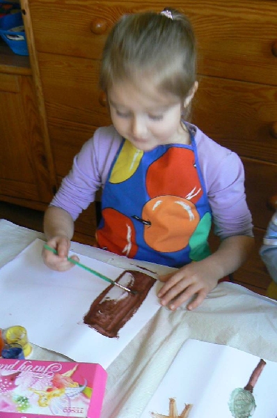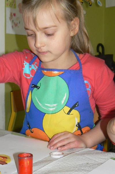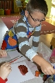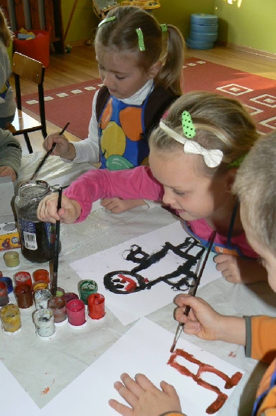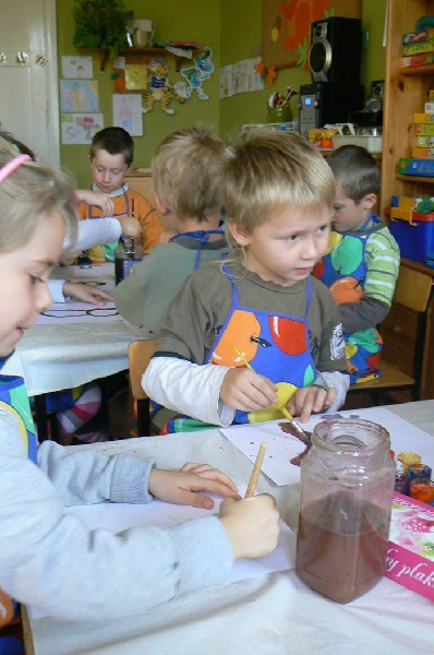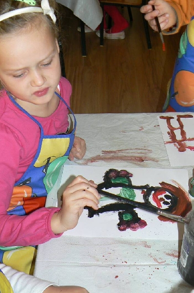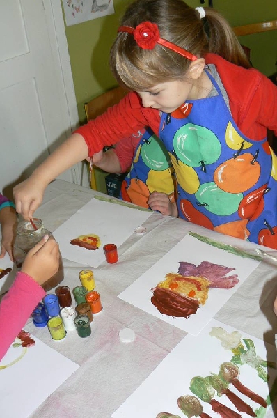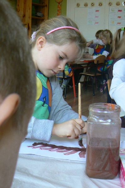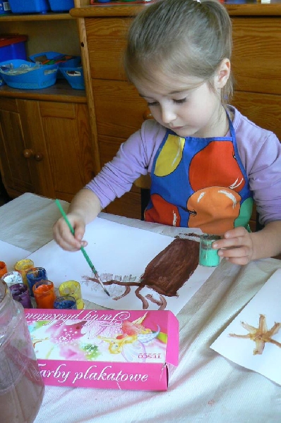 Szare, jesienne dni wzbogacamy kolorowymi farbami. Malowaliśmy postać pana Listopada, który ,,.... z liści złotych ma berecik, a kubraczek z nut".