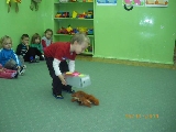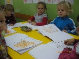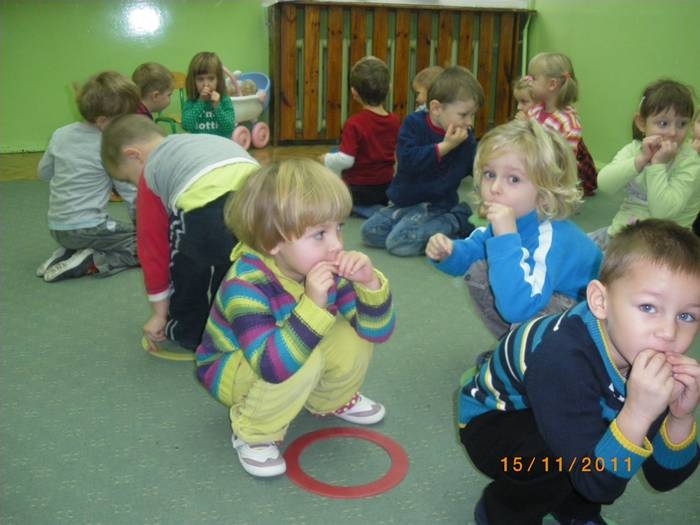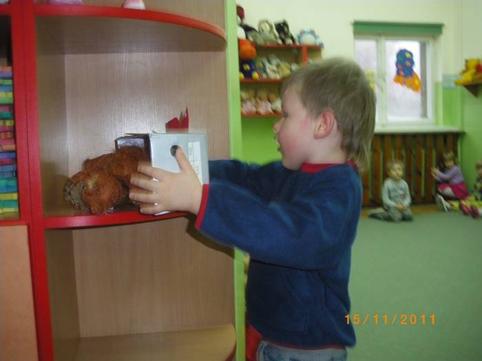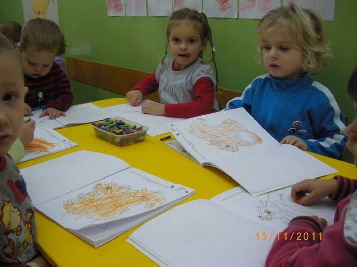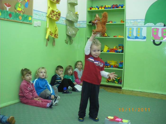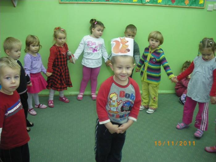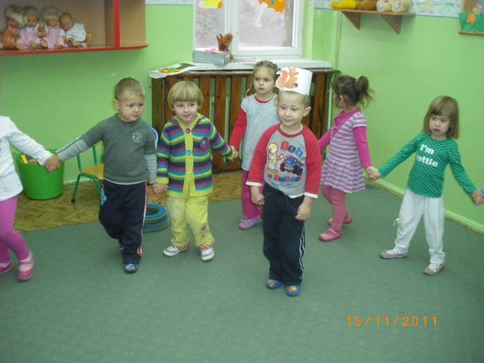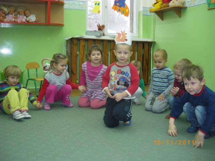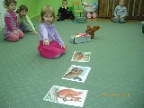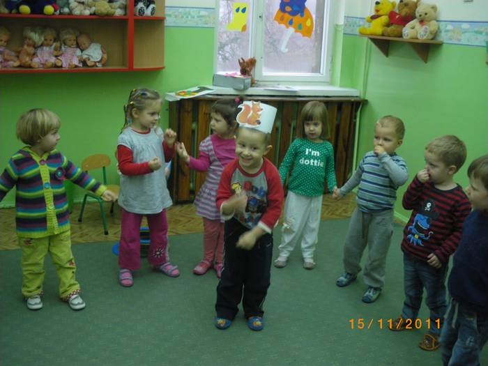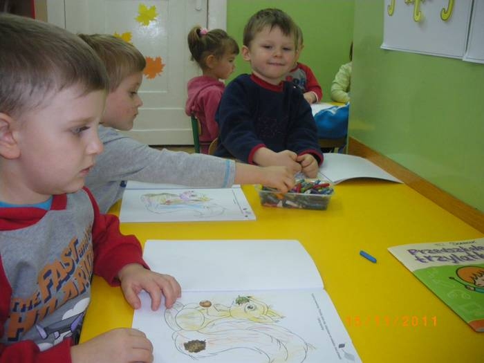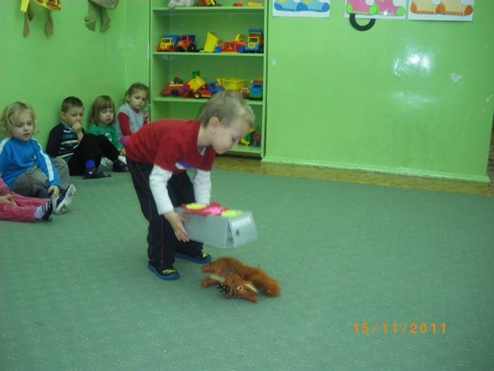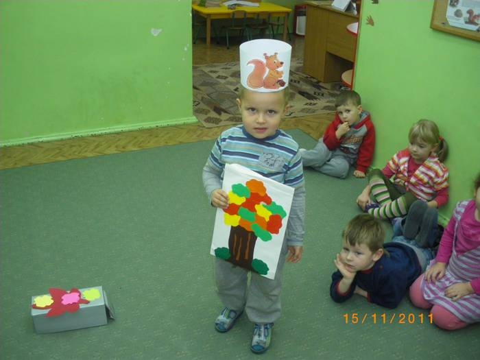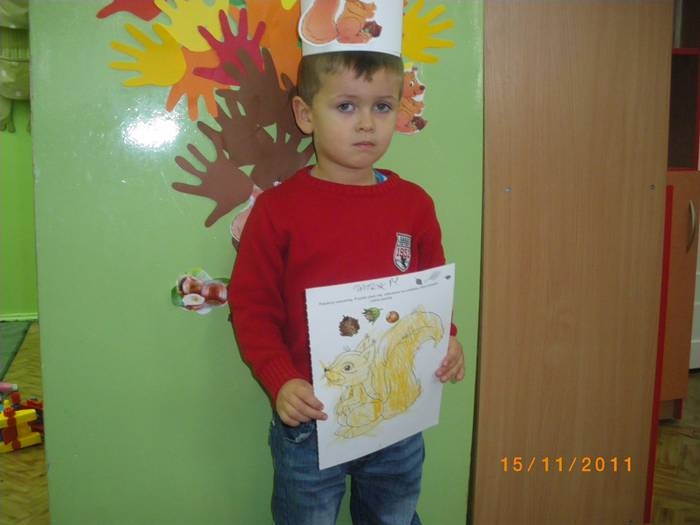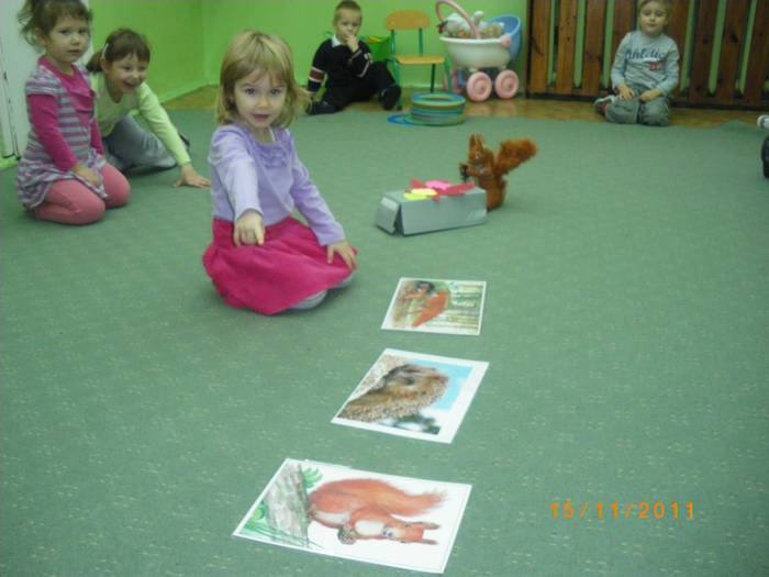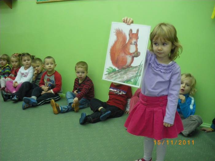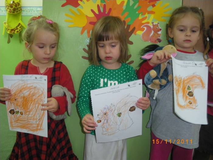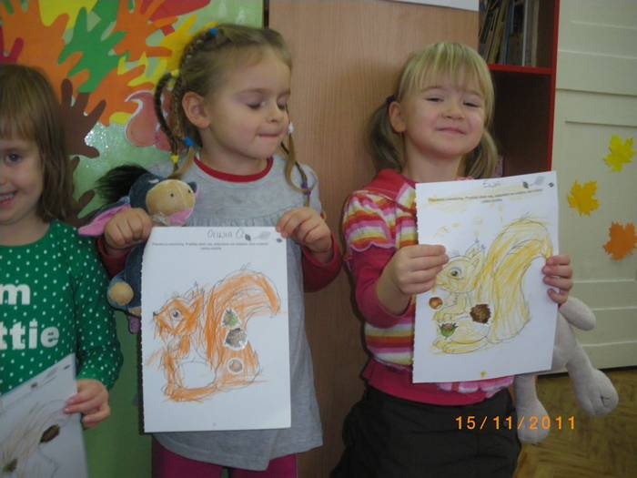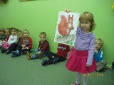 Maluszki na zajęciach poznały wiewiórkę. Wiedzą już jak wygląda to zwierzątko, jaki ma kolor, w jakim środowisku mieszka i czym się odżywia. Potrafią rozpoznać wiewiórkę wśród innych zwierząt.Dzieciom pomogła Pani Jesień zostawiając list w przedszkolu, w którym była pewna podpowiedź dotycząca wiewiórki.