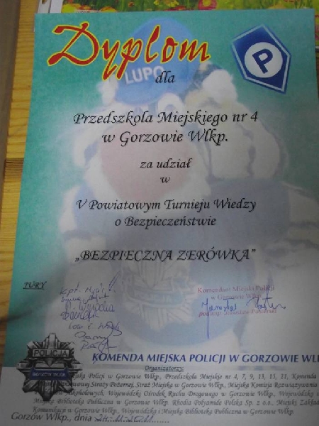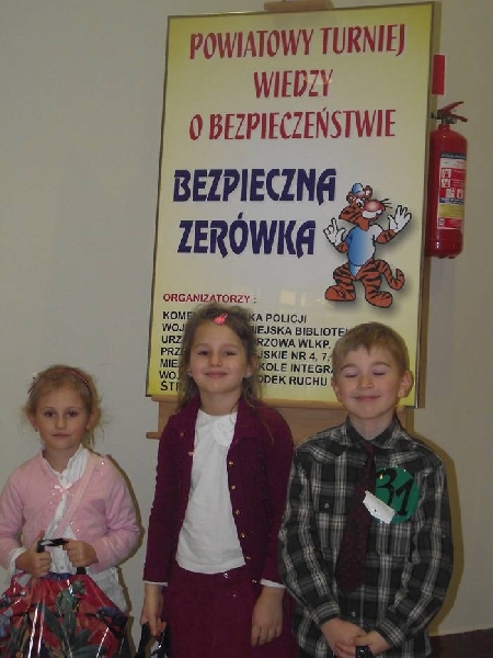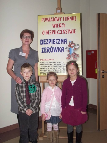 Dnia 24 listopada 2011 roku nasze przedszkole reprezentowało troje dzieci z grupy starszaków w V Powiatowym Turnieju Wiedzy o Bezpieczeństwie ,,Bezpieczna Zerówka”. Martyna, Filip oraz Oliwia dzielnie udzielali odpowiedzi na trudne pytania i walczyli o punkty. Każdy z uczestników otrzymał ciekawe prezenty, a przedszkole wzbogaciło się o płytę CD z pt. ,,Bezpieczna Droga”.