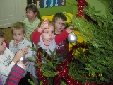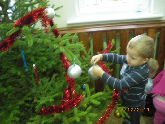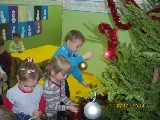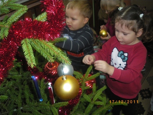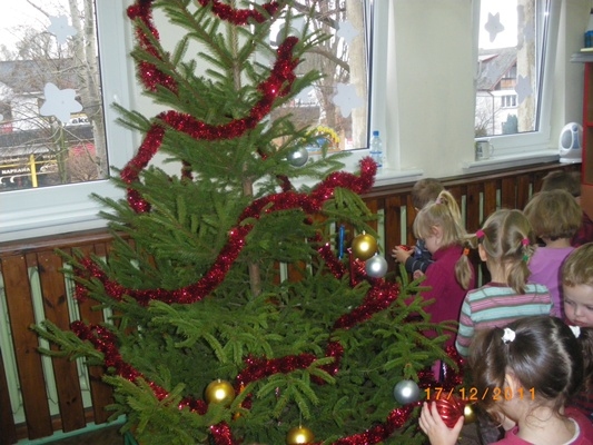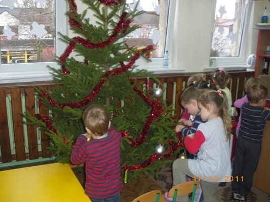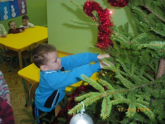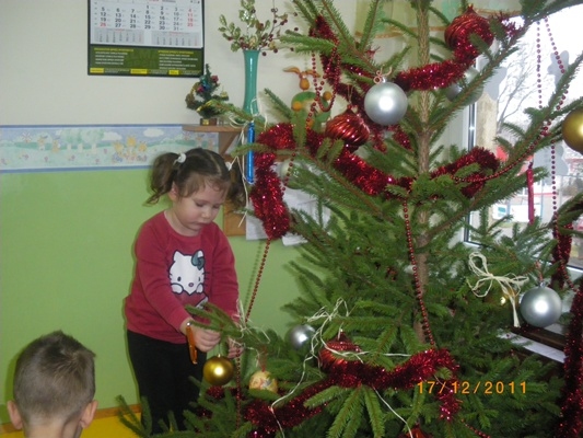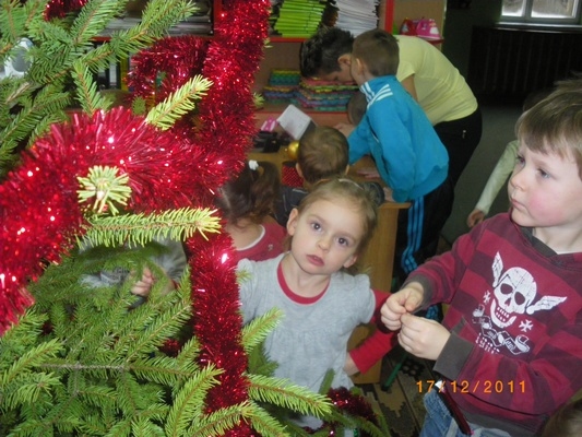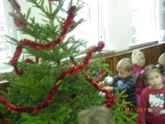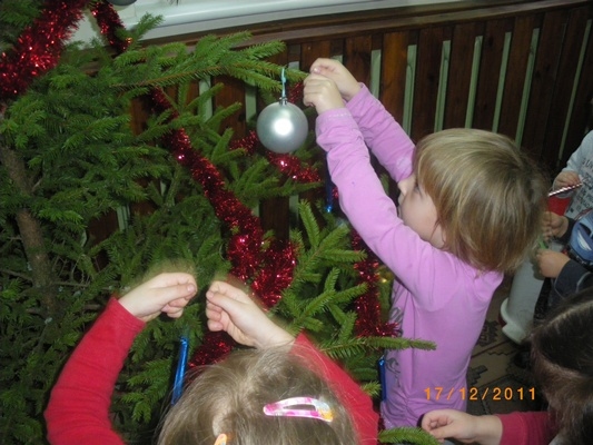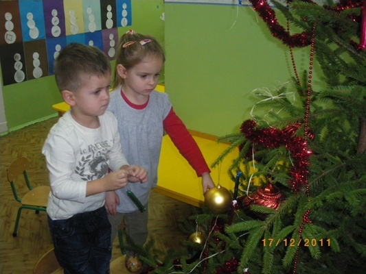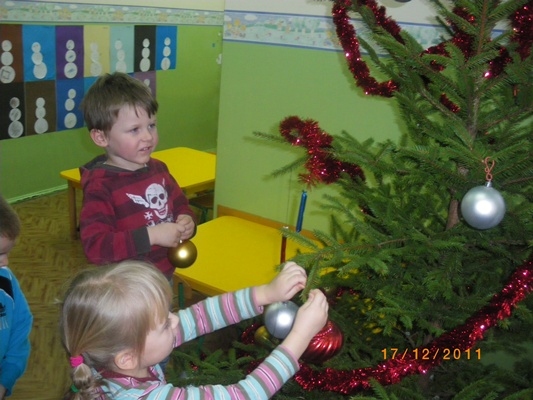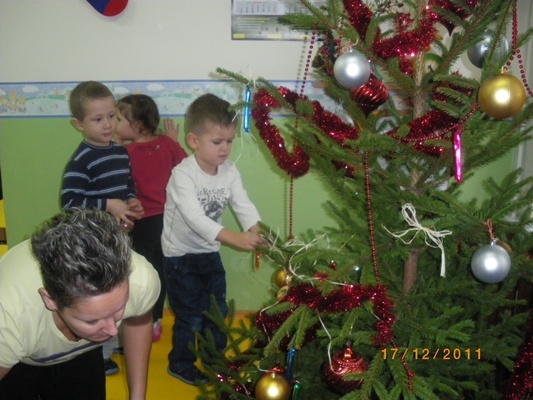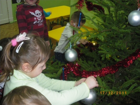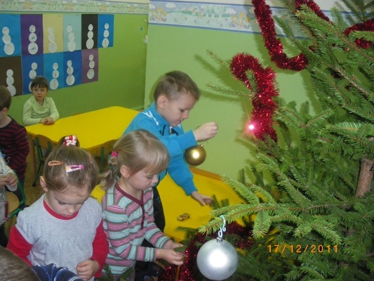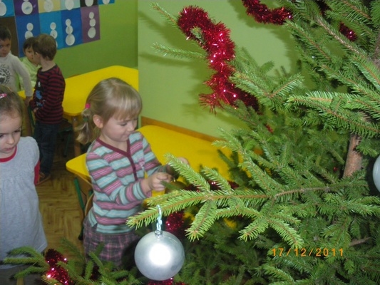 Dzieci wielkimi krokami przygotowują się do Świąt Bożego Narodzeni. Maluszki wykonały już kartki świąteczne, upiekły pierniczki. Jednak bardzo ważnym elementem jest ubieranie przedszkolnej choinki! Maluchy wspólnie z nauczycielkami udekorowały drzewko, wykorzystując przygotowane wcześniej ozdoby i słodycze.