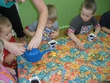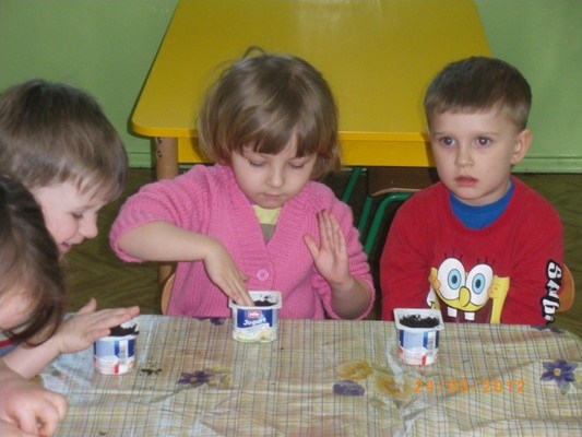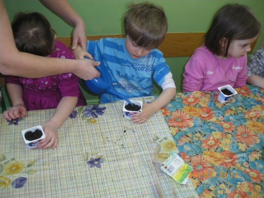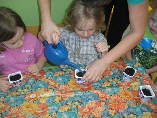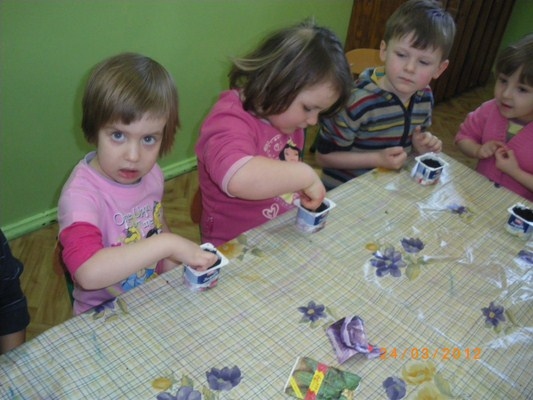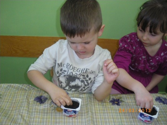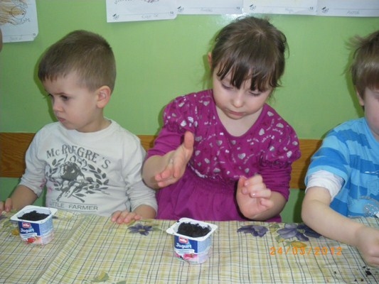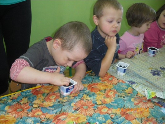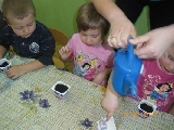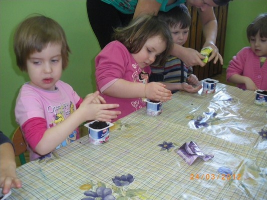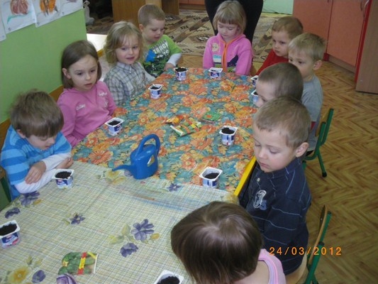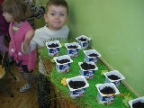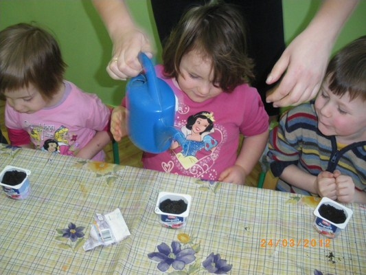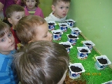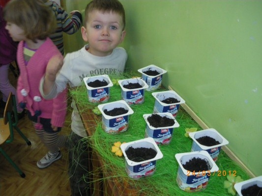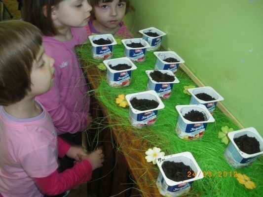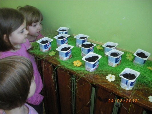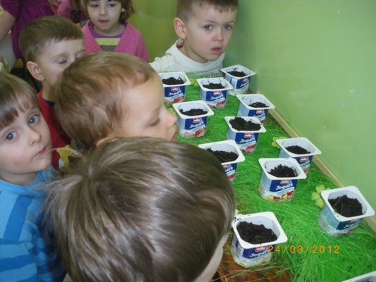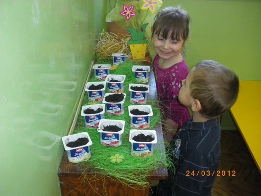 Nadeszła wiosna maluszki postanowiły założyć w swojej sali wiosenny kącik przyrody. Samodzielnie zasiały w nim pietruszkę, rzeżuchę oraz zasadziły fasolę i cebulę. Przedszkolaki oglądały różne nasiona i cebulki, porównywały ich kształty, kolory i wielkości oraz dowiedziały się jak należy pielęgnować rośliny, by dobrze rosły. Teraz dzieci będą codziennie podlewać swój mini ogródek i oczekiwać pierwszych plonów. Kiedy roślinki wyrosną będą nie tylko ozdobą sali, ale także źródłem witamin na kanapkach.