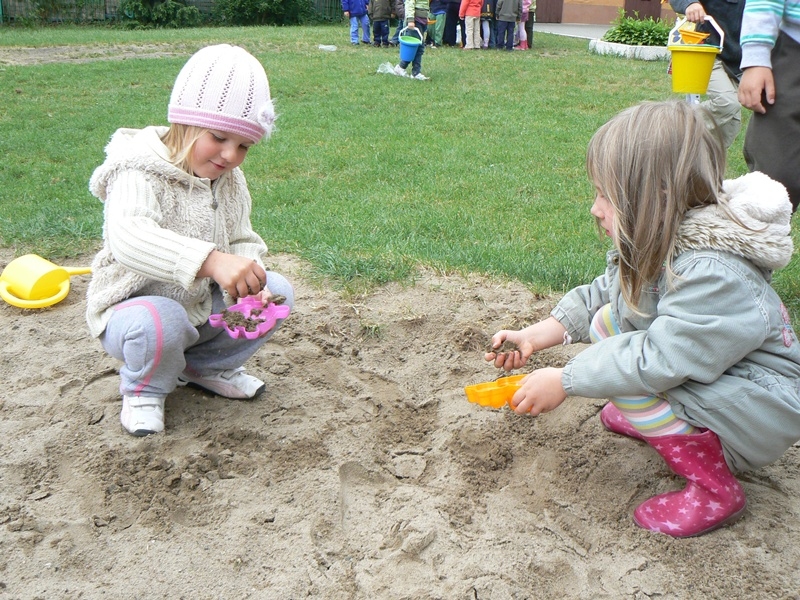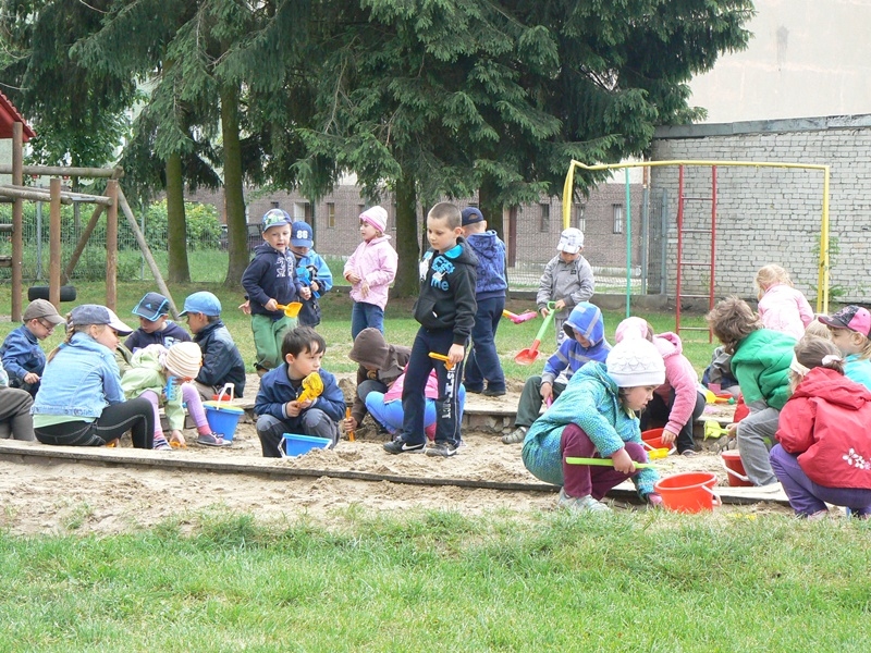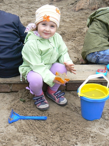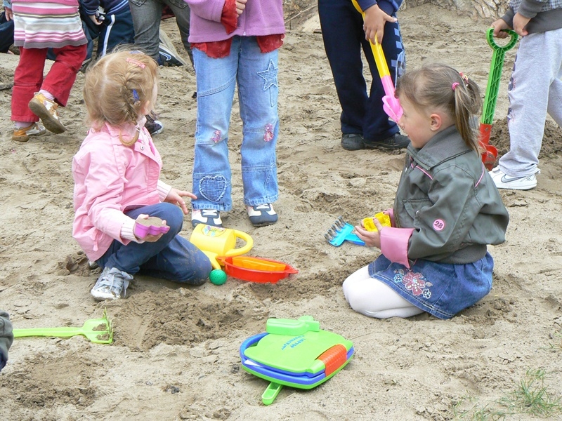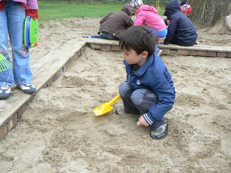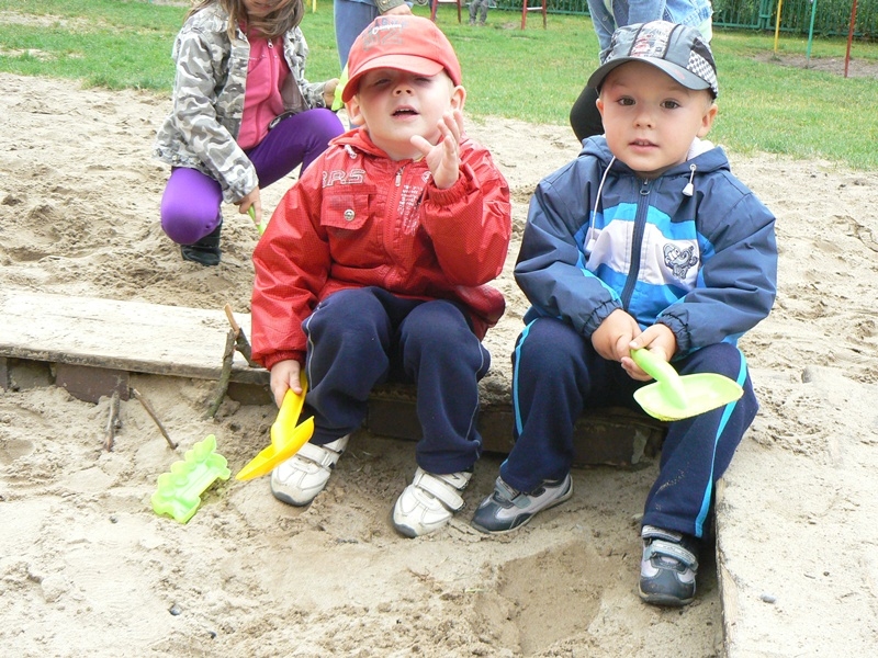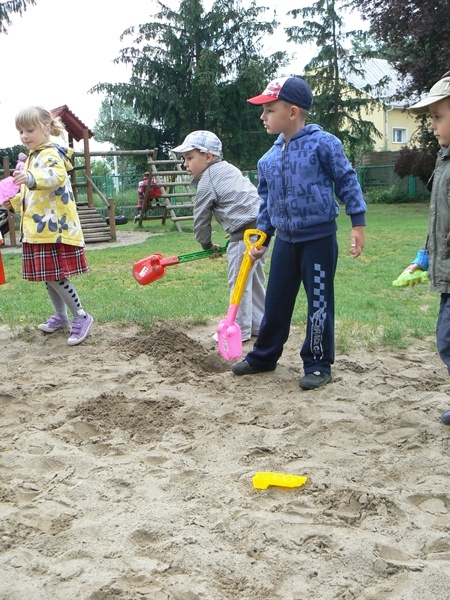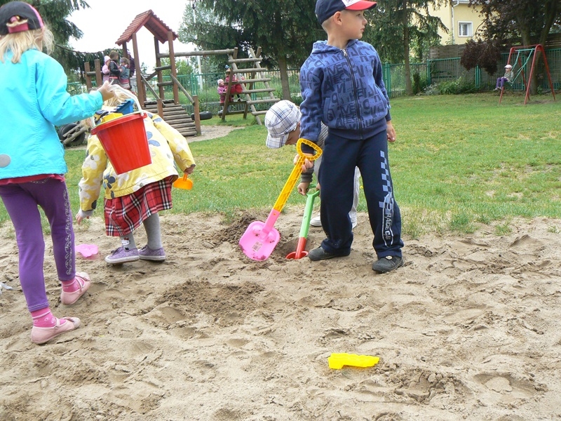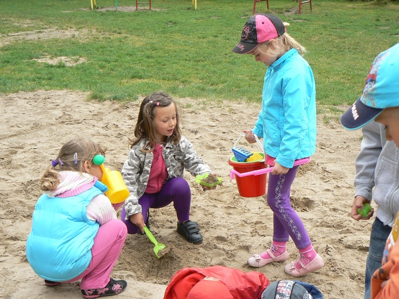 Wiele radości sprawiły naszym przedszkolakom nowe zabawki do piaskownicy. Zimna aura nie przeszkodziła w ciekawym budowaniu z piasku.