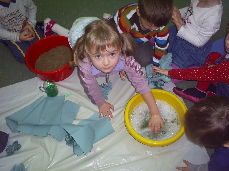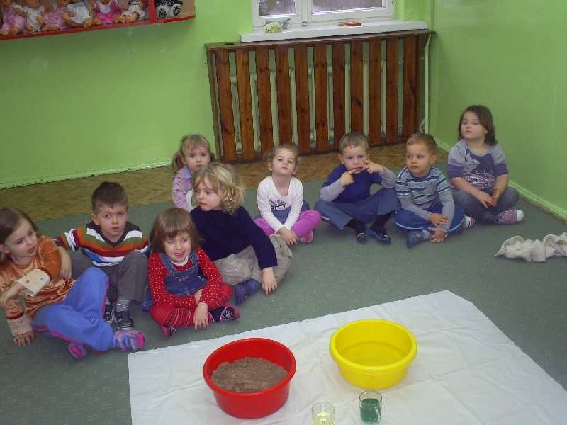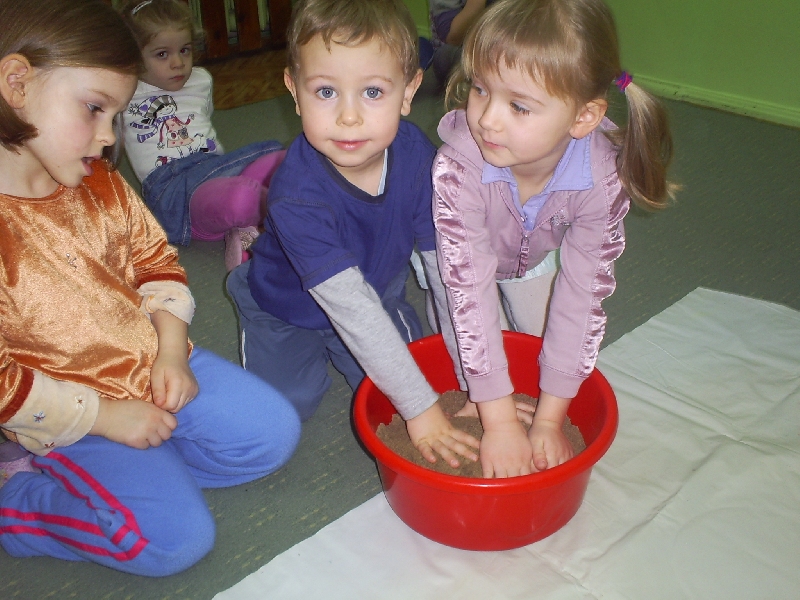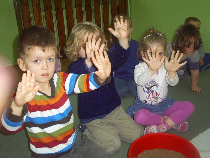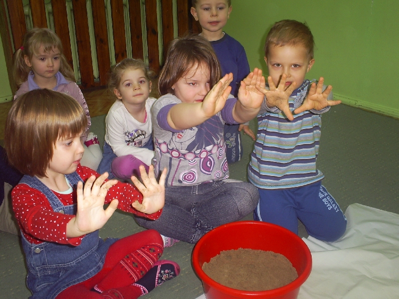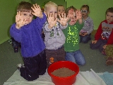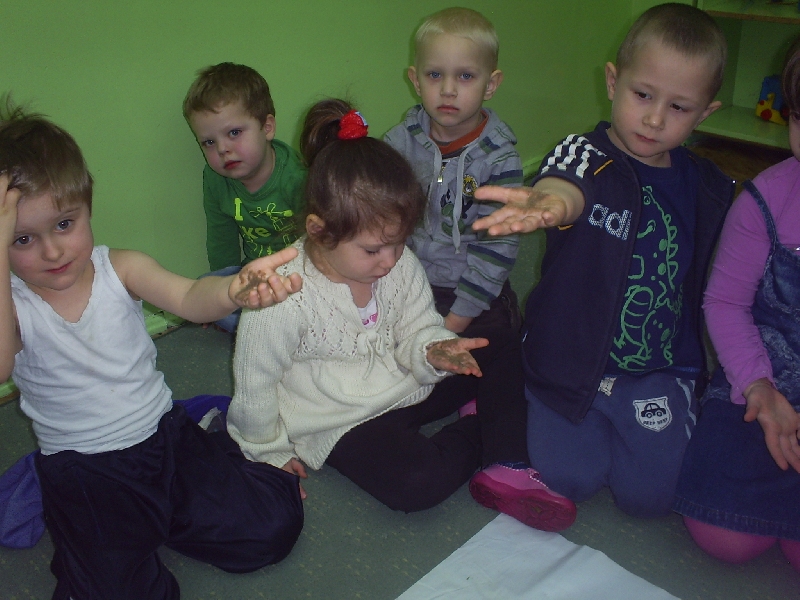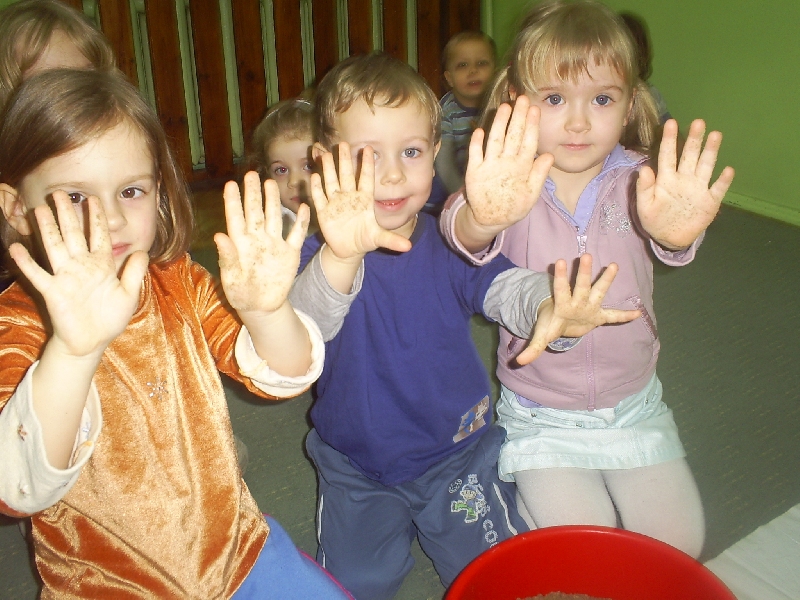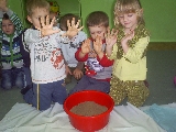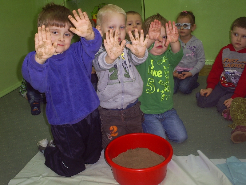 Mamy coraz więcej wiedzy. Tym razem dzieci dowiedziały się dlaczego do rąk wysmarowanych olejem lepiej przykleja się piasek i dlaczego dodany do wody płyn do naczyń powoduje łatwiejsze usunięcie tego piasku.