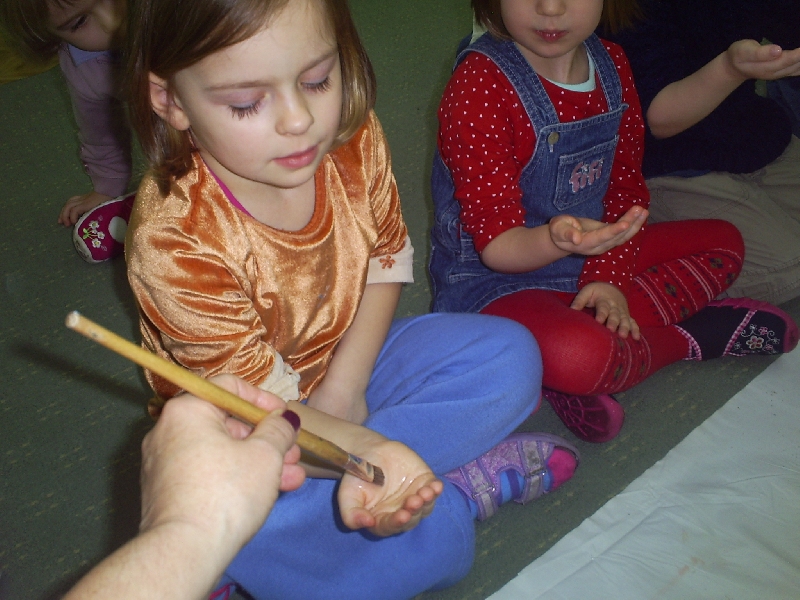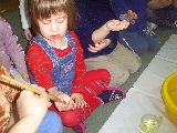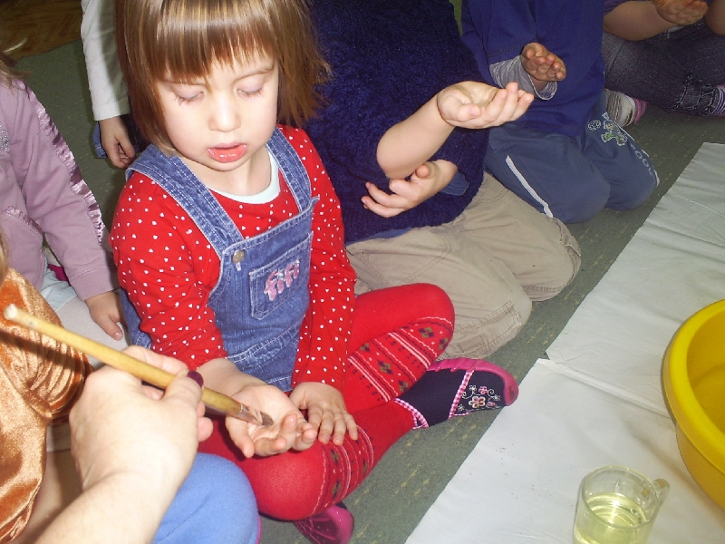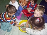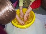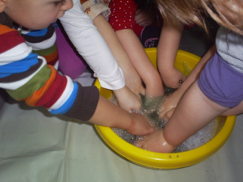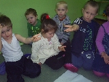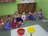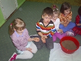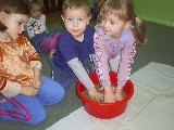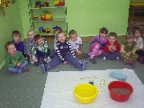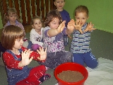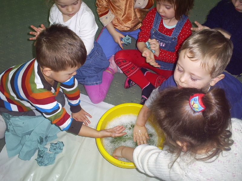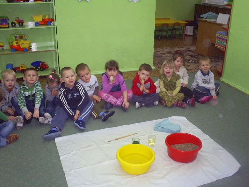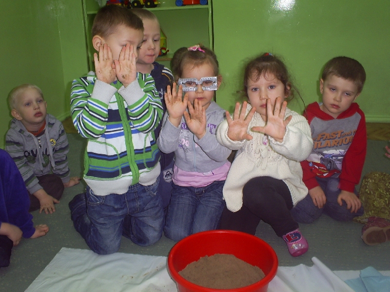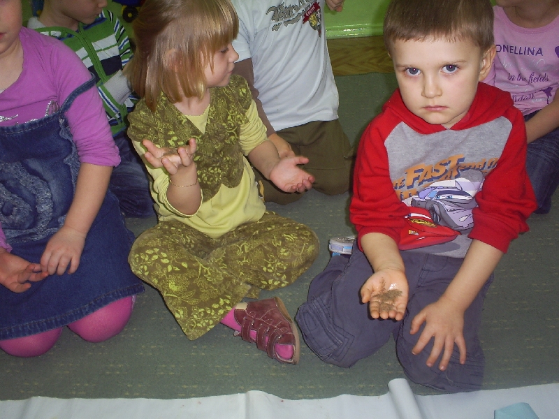 Mamy coraz więcej wiedzy. Tym razem dzieci dowiedziały się dlaczego do rąk wysmarowanych olejem lepiej przykleja się piasek i dlaczego dodany do wody płyn do naczyń powoduje łatwiejsze usunięcie tego piasku.