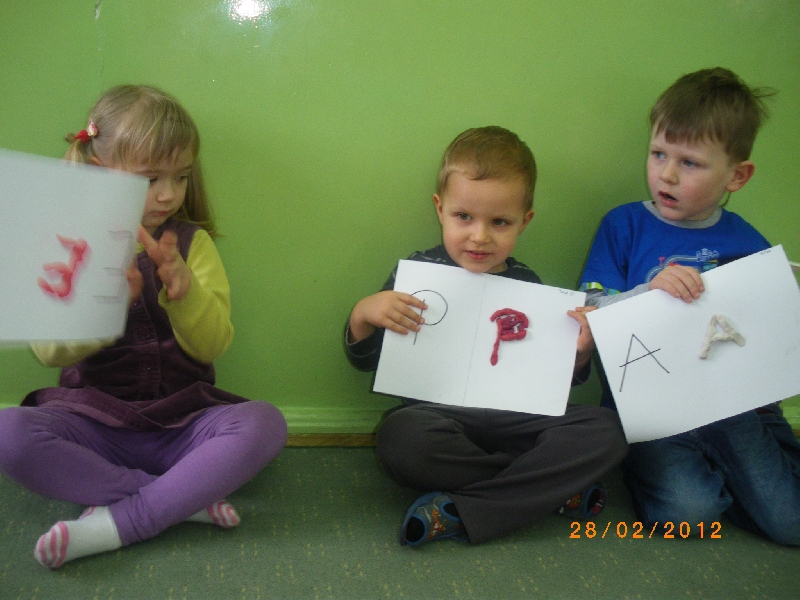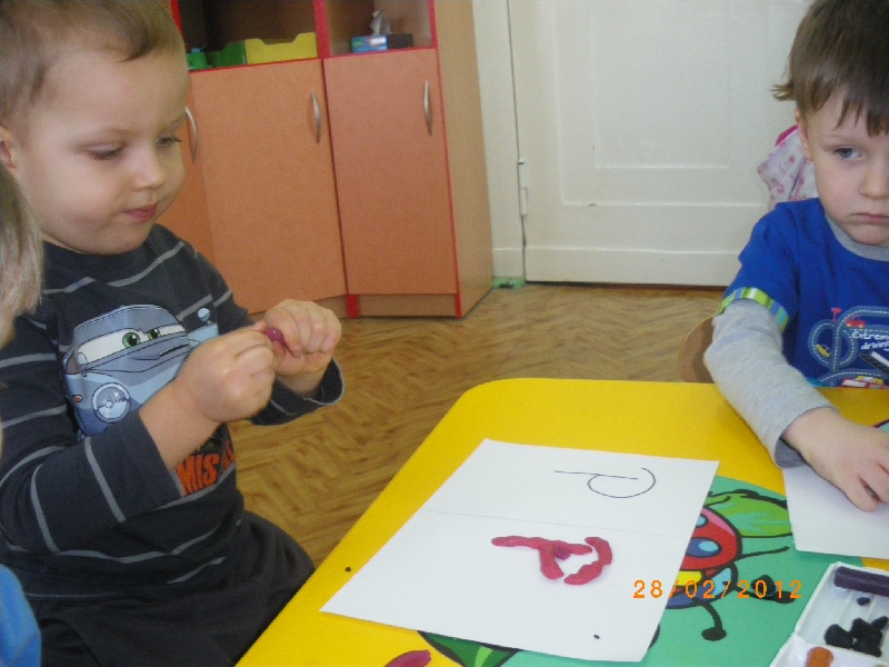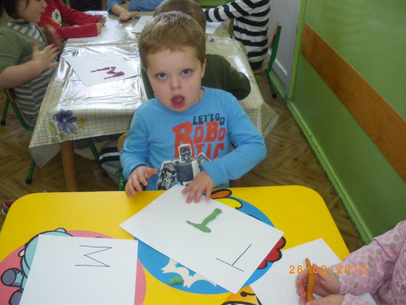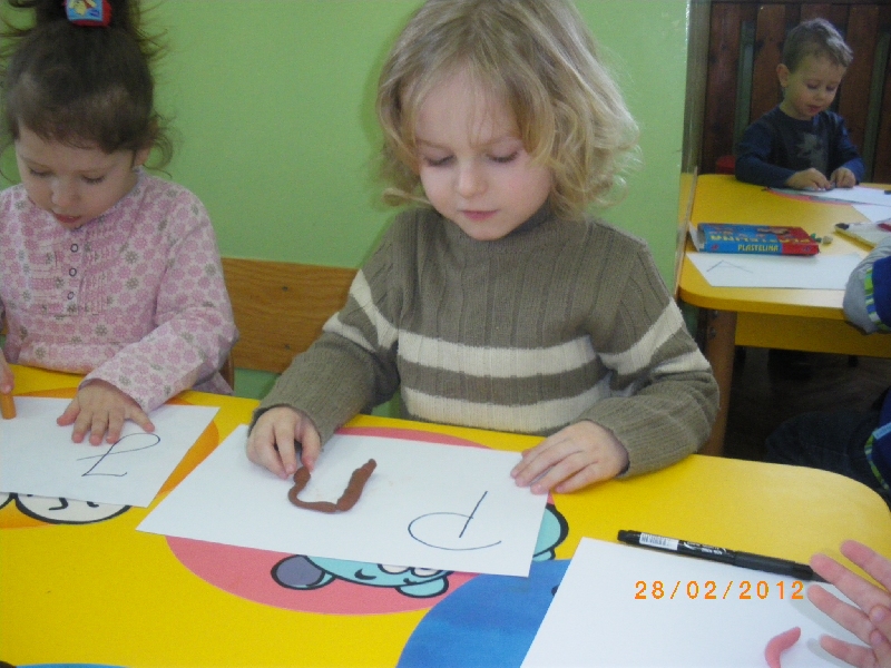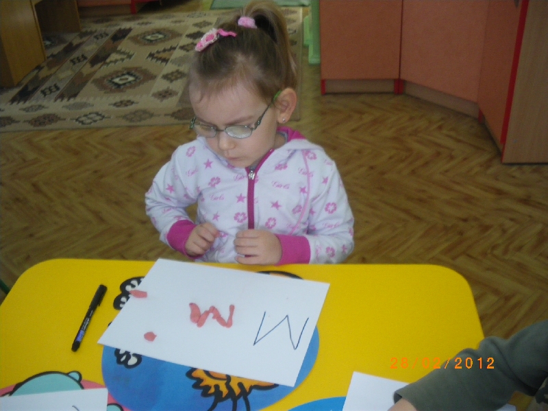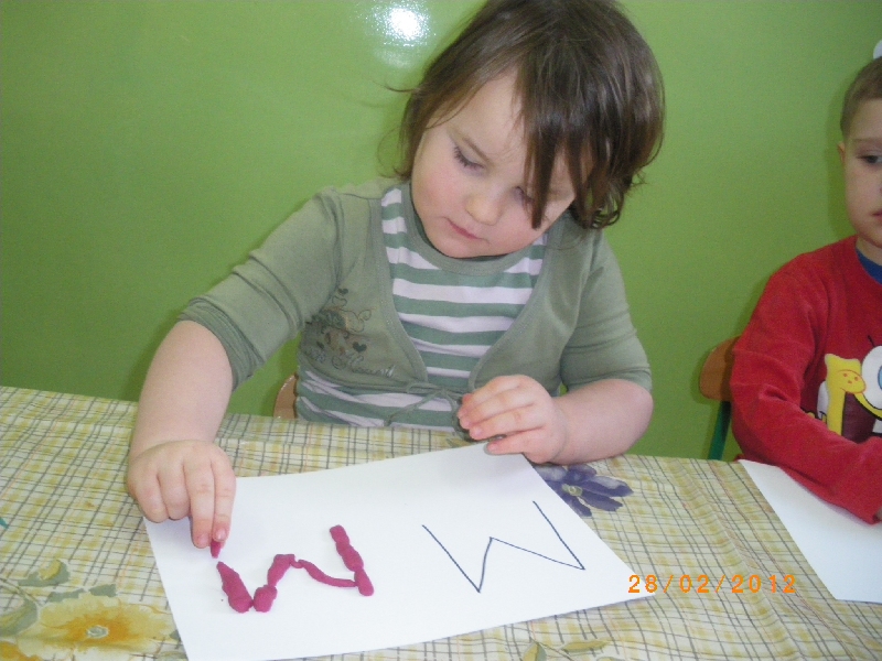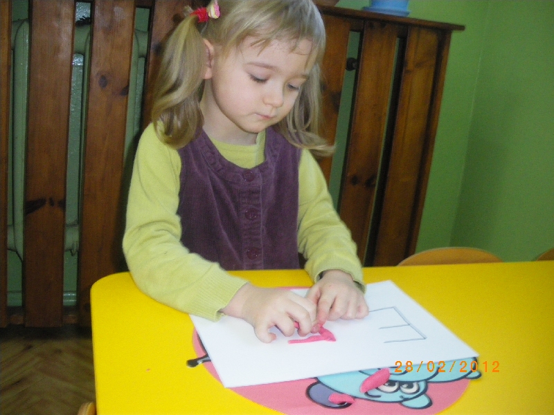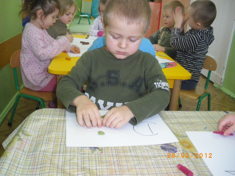 Zajączek przygotował kolejne zadanie. Dzieci lepiły z plasteliny pierwszą literkę swojego imienia. Po ty zajęciu dzieci wiedzą, że imiona piszemy wielką literą.